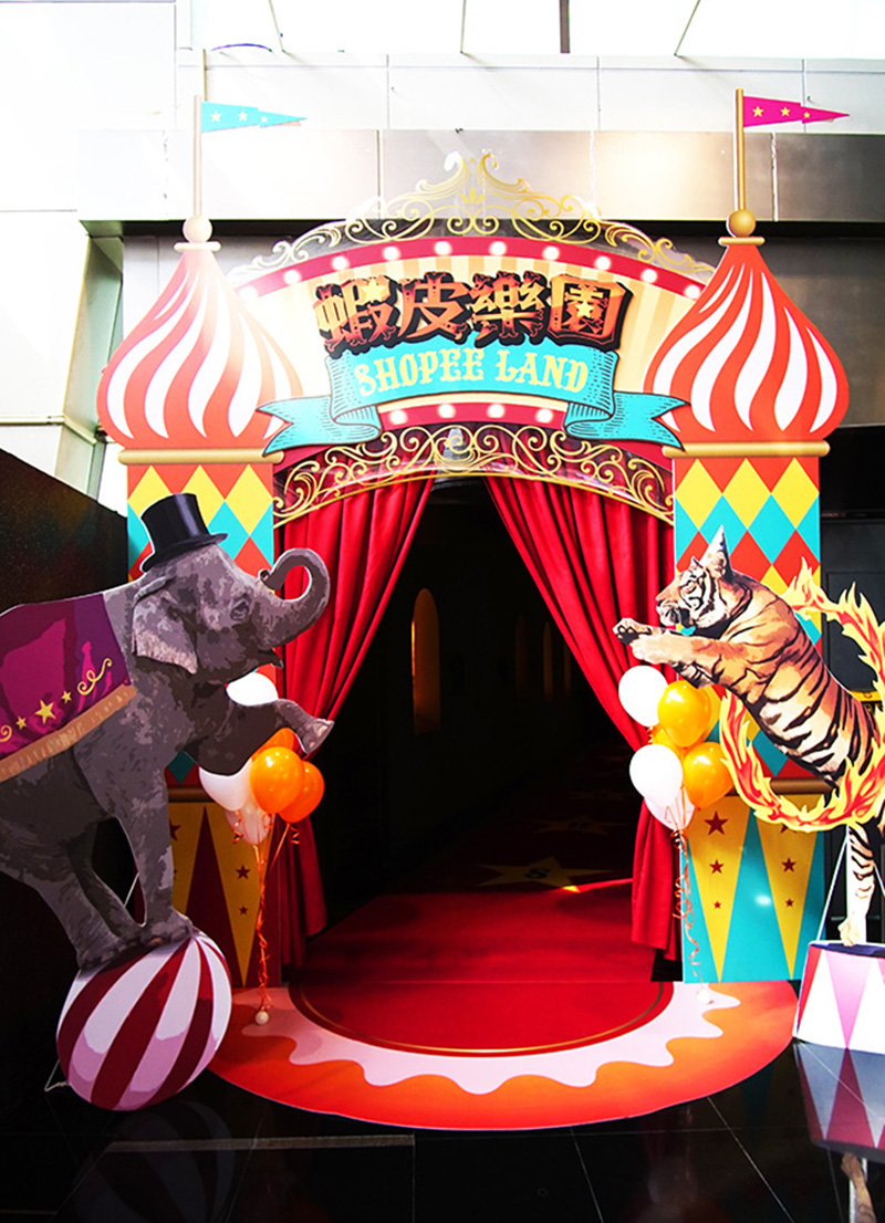 蝦皮拍賣為回饋優良賣家所舉行之春酒暨頒獎典禮,整場活動以蝦皮樂園馬戲團為主題 , 將整個場地從入口到主舞台,所到行經動線皆用歡樂的馬戲團氛圍包裝 , 每一處都讓賓客想要拍照留念。